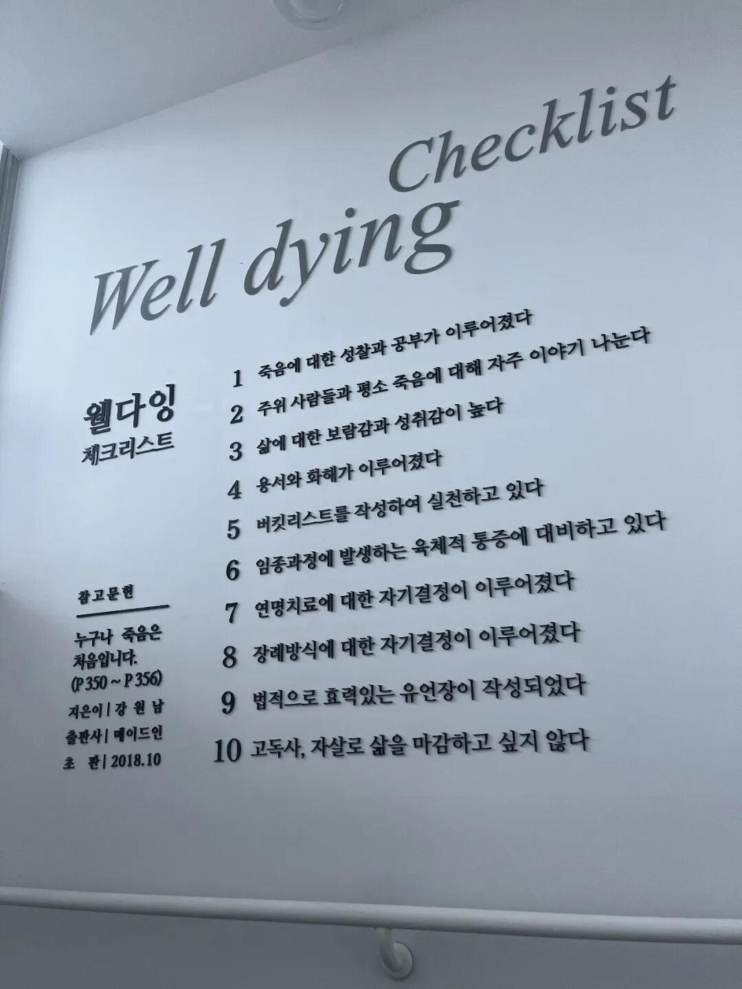 咨询处的墙上还列出了一个“善终”的清单,摘自韩国作家姜源男的书《死亡,对任何人来说都是第一次》(누구나 죽음은 처음입니다),似乎这个文化村的存在是为了探索死亡哲学。如今韩国已经步入老龄化社会,思考死亡是一个很现实,也很热门的话题。