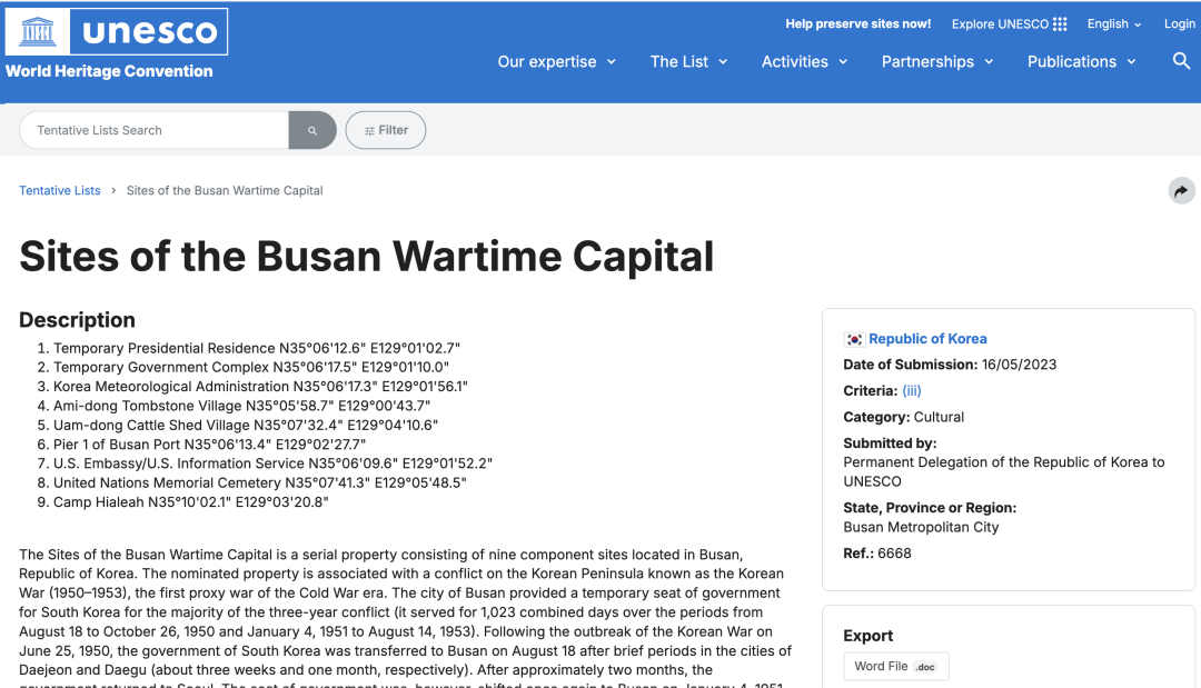 现在,韩国正努力将峨眉洞碑石文化村申请为世界文化遗产(韩国济州岛的大屠杀,“申遗”成功!)。访问联合国教科文组织的网站,我看到,峨眉洞作为“韩国战时首都釜山”(Sites of the Busan Wartime Capital)的一部分,已经出现世界文化遗产暂定名录上了。