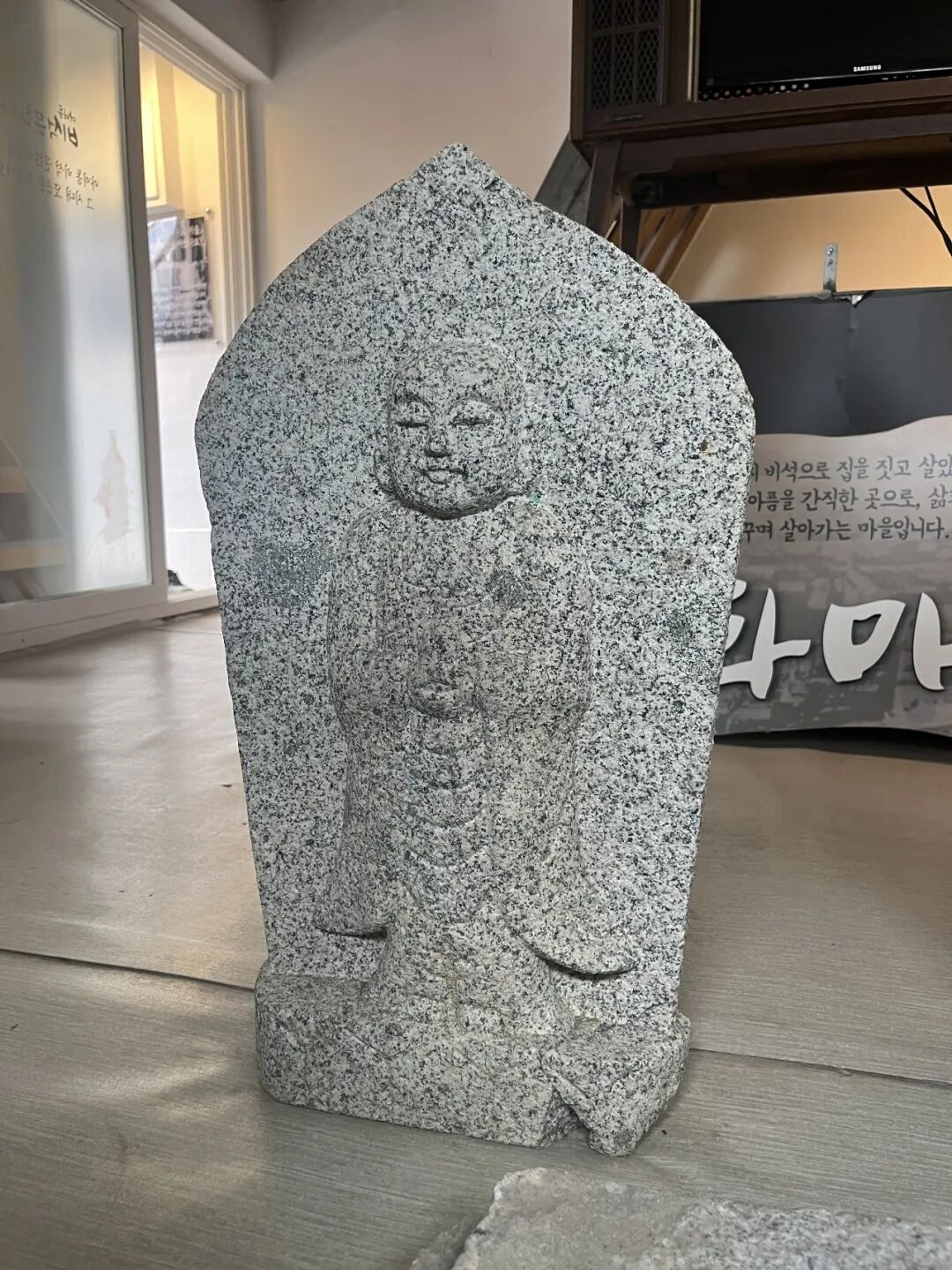 其中一个房间里,还放在一个石佛像。根据地图上的介绍,这尊石佛像是在厕所发现的。当时施工人员在修整厕所,在地板上发现这个正面朝下的佛像。