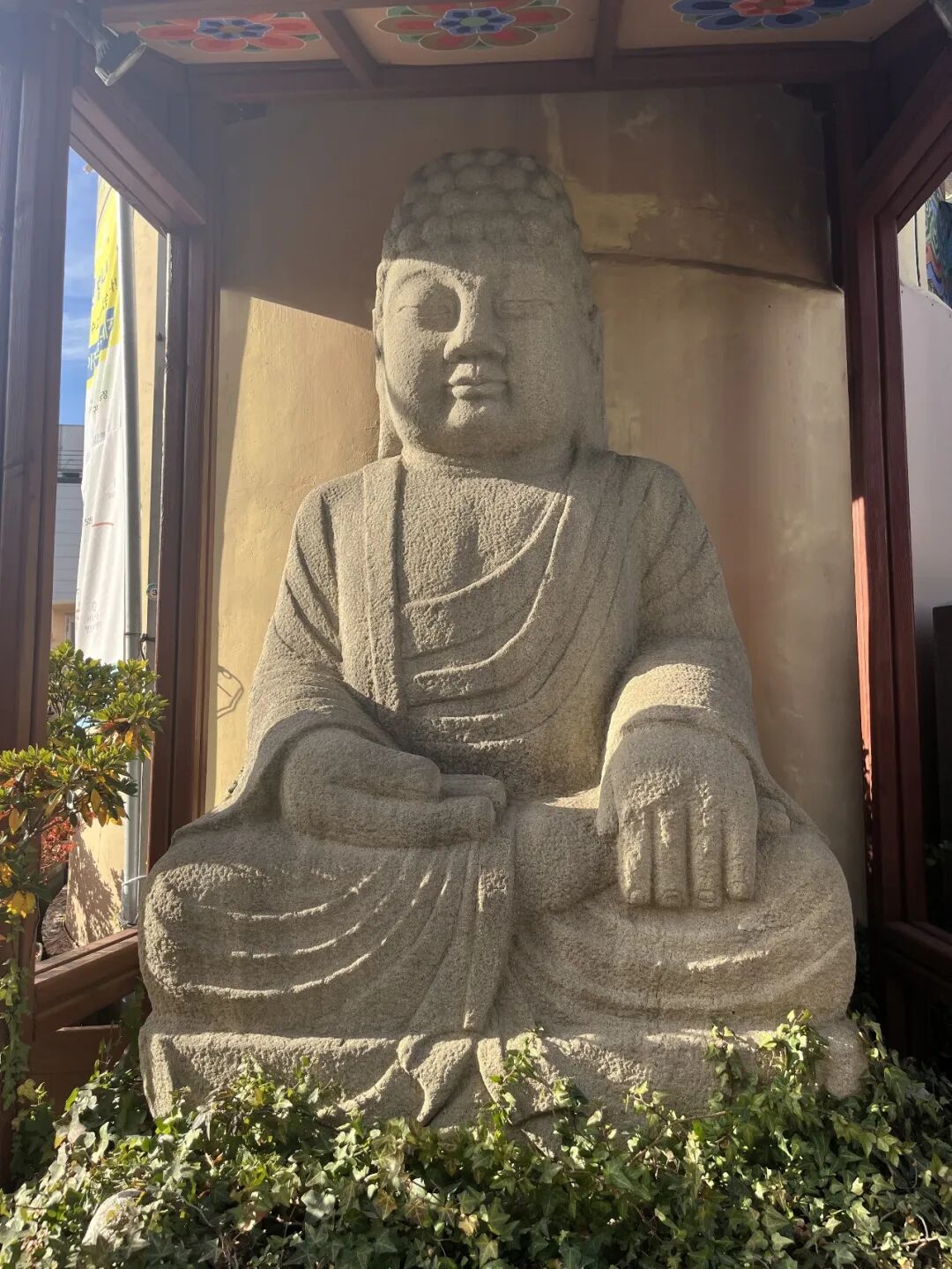 从南边下山,我也没看不到任何神社的痕迹。倒是见到一座佛教寺院,旁边有一尊胖嘟嘟的石佛像。