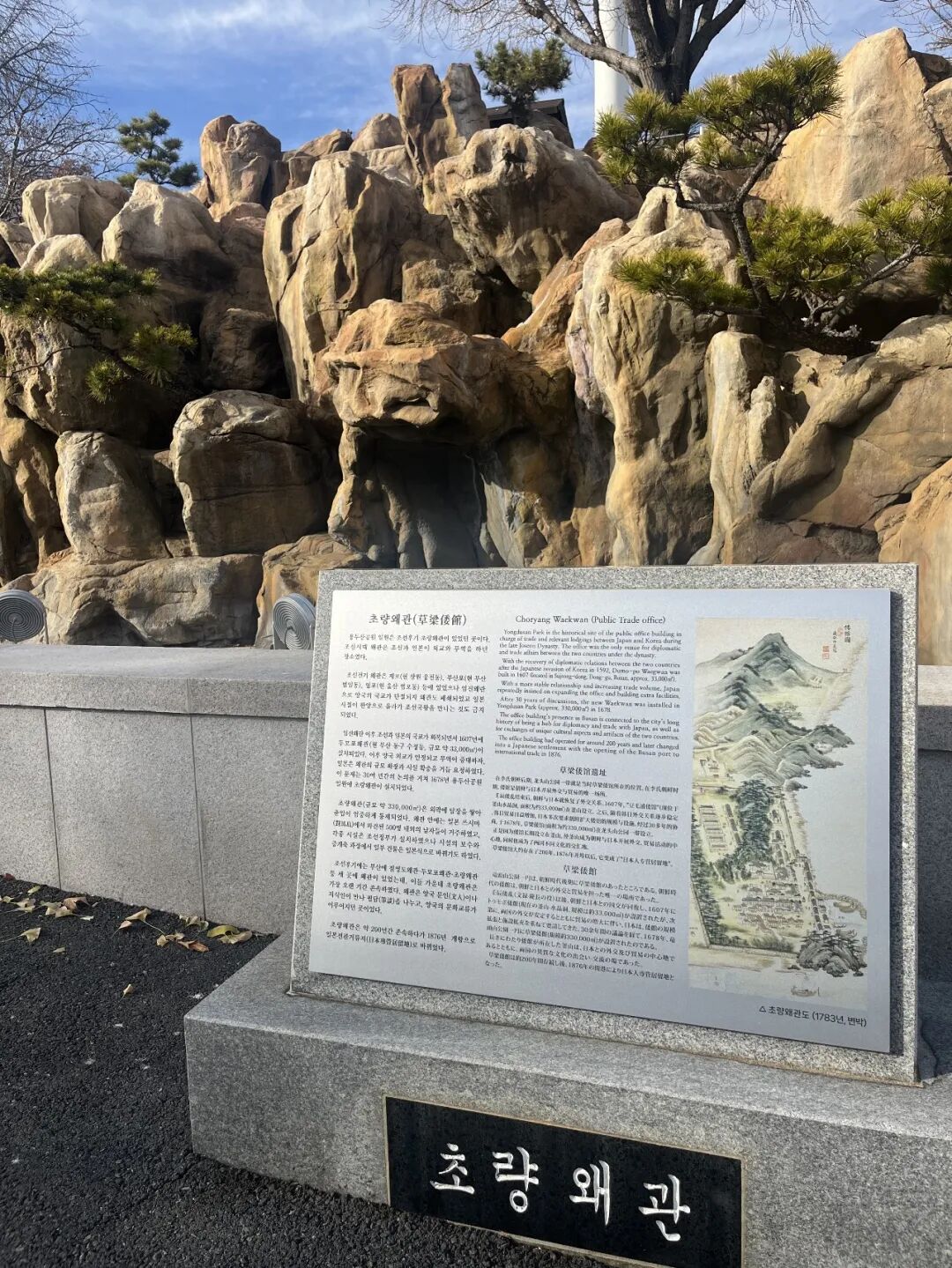 再往下走,台阶旁边的假山边,我看见一块说明牌,写着“草梁倭馆”。韩国仍将当时的日本称为“倭”。这里,和日本果然有很大的历史渊源。