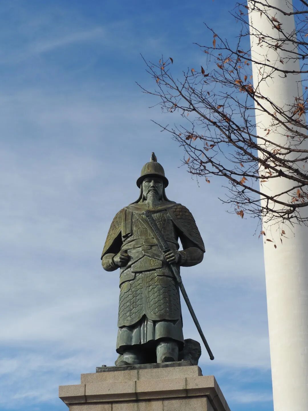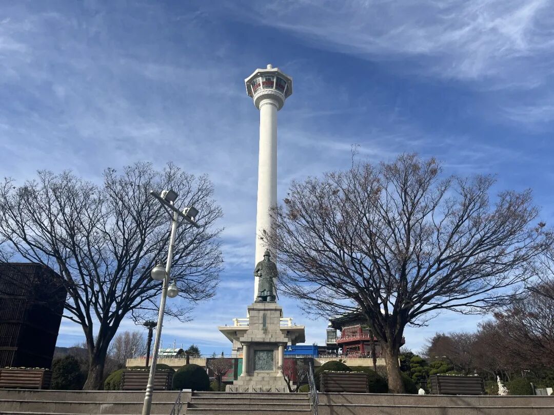 釜山塔下的广场上立着各种纪念碑和人物雕像。正对釜山塔的是李舜臣将军的巨大铜像,基座上的浮雕描绘了他率领龟船击退丰臣秀吉所派遣的日本军队的场景。那场朝鲜与日本之间的战争,韩国称为“壬辰倭乱”。
