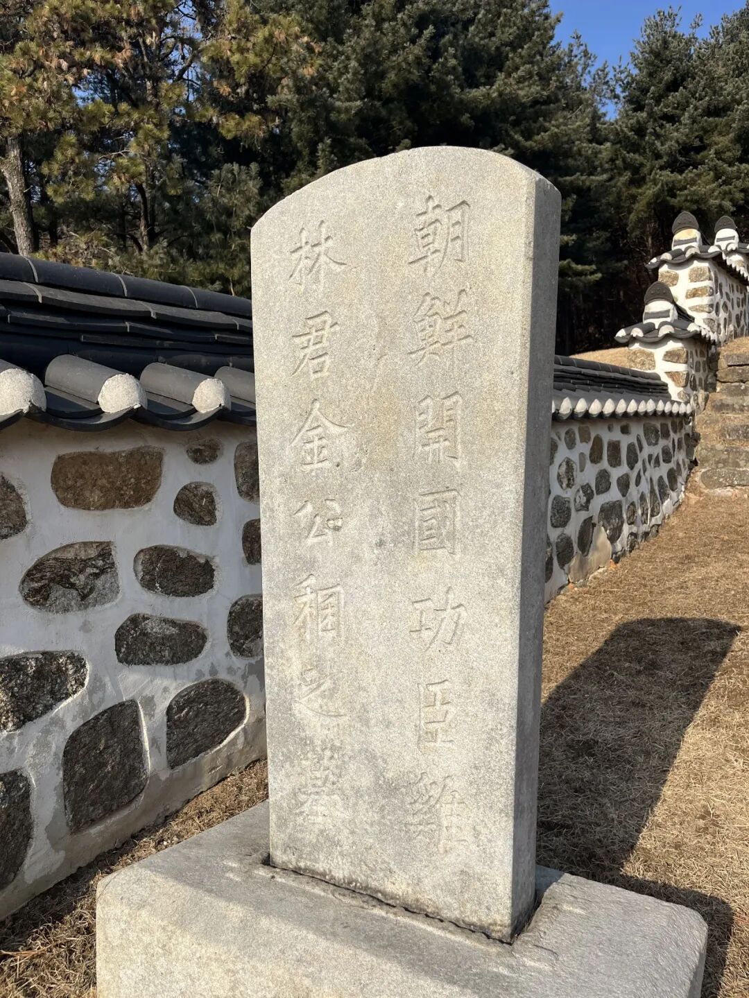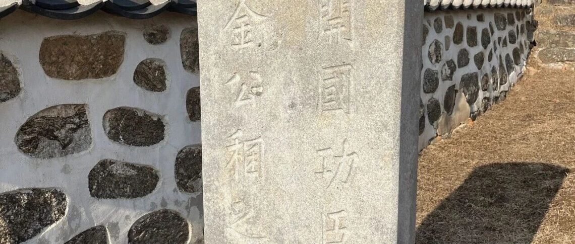 碑文正面写着“朝鲜开国功臣鸡林君金公稛之墓”。在背面的正文上,写的时间是“朝鲜开国497年”,也就是1888年。