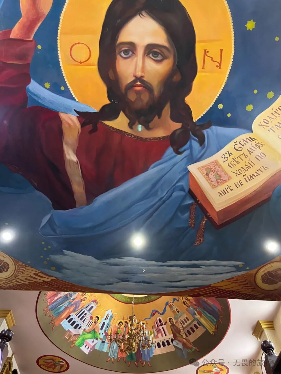 进入之后还要登上一小段台阶才能接近祭坛。抬头一看天花板,是一个巨大的耶稣画像,手捧圣经,背景是浩瀚的星辰,似乎他正要告诉世人宇宙的真理。
