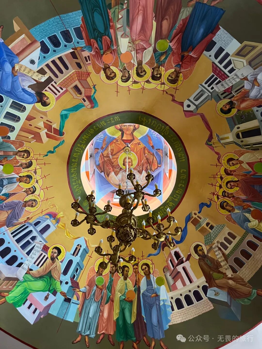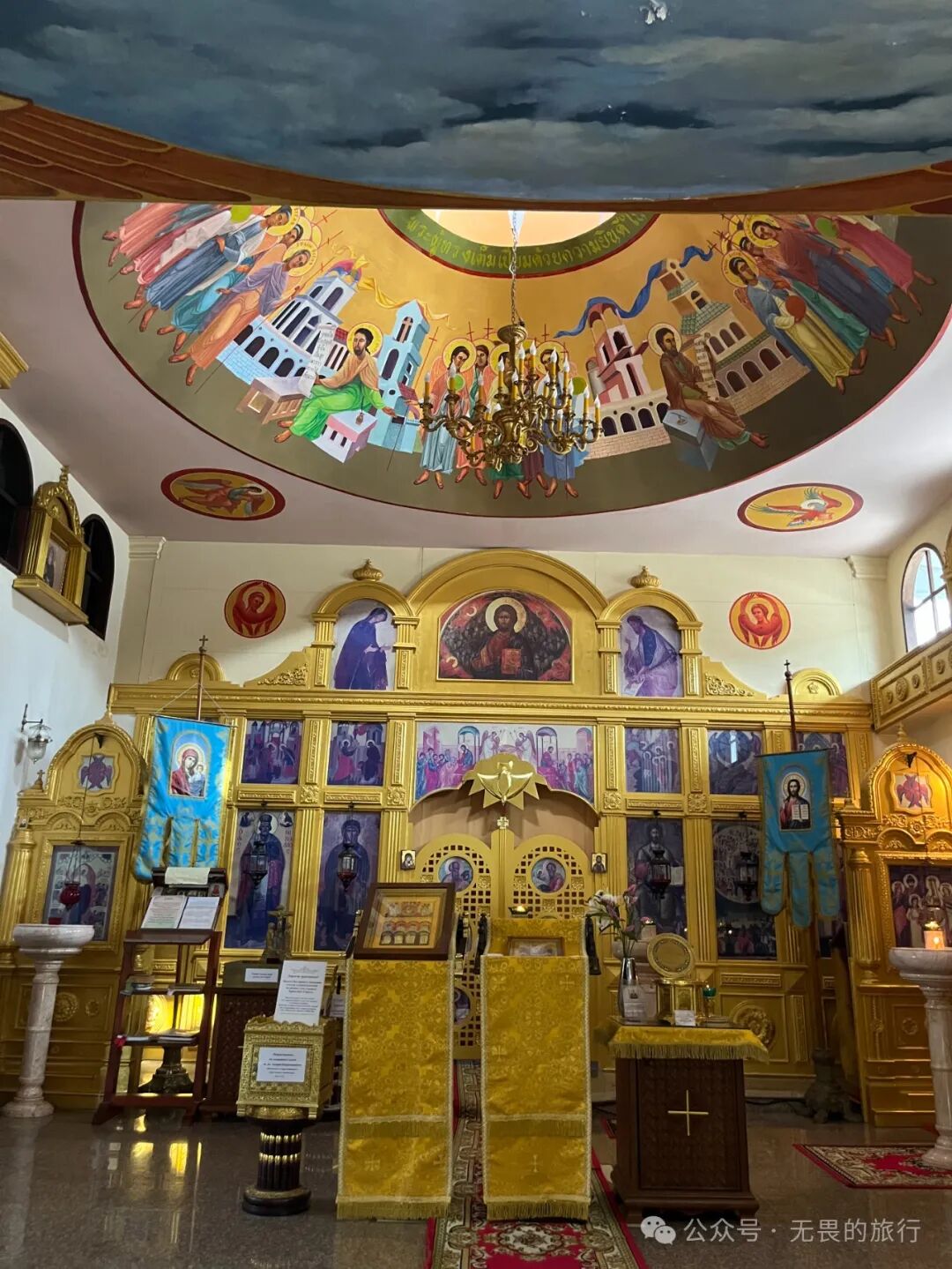 祭坛上方的穹顶,刻画了基督教人物,中间的圆圈上却写着泰语,称颂着圣母玛利亚。此外,正殿里供奉着东正教尤为重视的圣人圣尼古拉(Άγιος Νικόλαος)的画像。