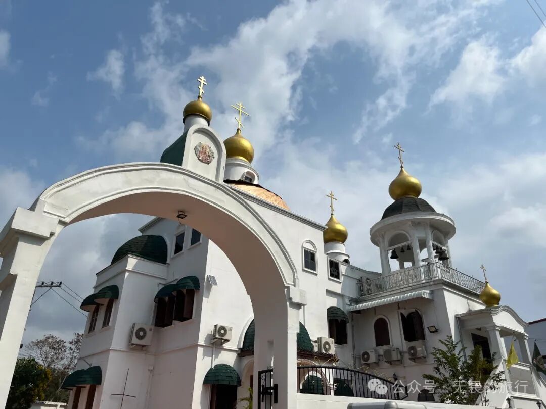 拐进小路,就能见到这座异域建筑。这座教堂被命名为“诸圣东正教堂”。建筑墙体涂白,洋葱头顶和十字架都是金色,在阳光照射下格外夺目。整座建筑里大部分都写着俄语,几乎见不到泰文和英文。